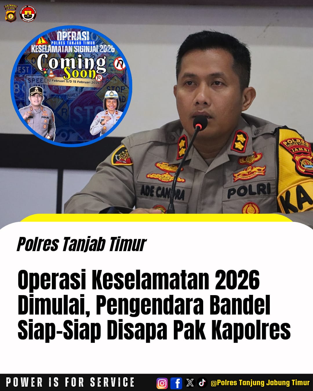 Kapolres Tanjung Jabung Timur AKBP Ade Candra, S.P., S.I.K. menegaskan bahwa keselamatan berlalu lintas bukan hanya menjadi tanggung jawab kepolisian, tetapi merupakan tanggung jawab bersama seluruh pengguna jalan.